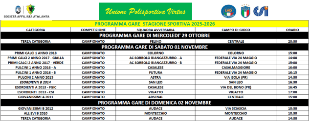 Programma gare weekend 1-2 Novembre 2025 Immagine 30 ottobre 202531 ottobre 2025upvirtus Condividi:Tweet Fai clic per condividere su WhatsApp (Si apre in una nuova finestra) WhatsApp Mi piace Caricamento... Correlati